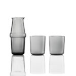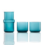 The Trio collection consists of three blown Murano glass elements: one pitcher and two glasses that overlap and combine, mixing transparent shades with decorated glass. Designer Marco Zito reinterprets a classic piece of Murano tradition, the bedside bottle, traditionally a gift from the fiancée to her future husband. Available in three different shapes and colors — laurel green, neutral grey, and air force blue — Trio was originally designed for the bedside table to provide water at night but is also perfect for the living room to enjoy a drink after dinner.